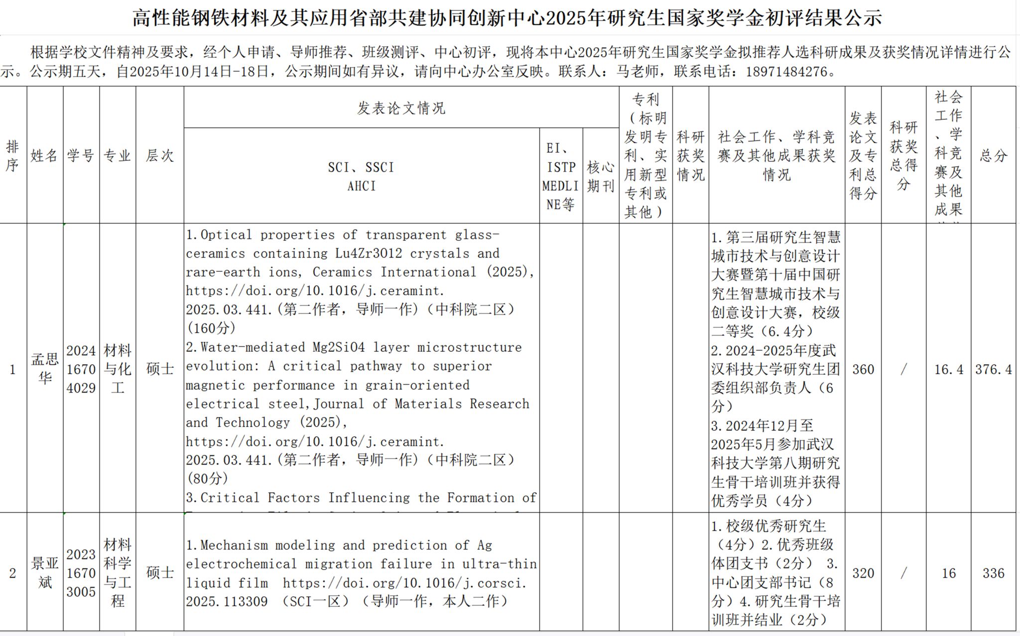 协同创新中心2025年研究生国家奖学金初评结果公示